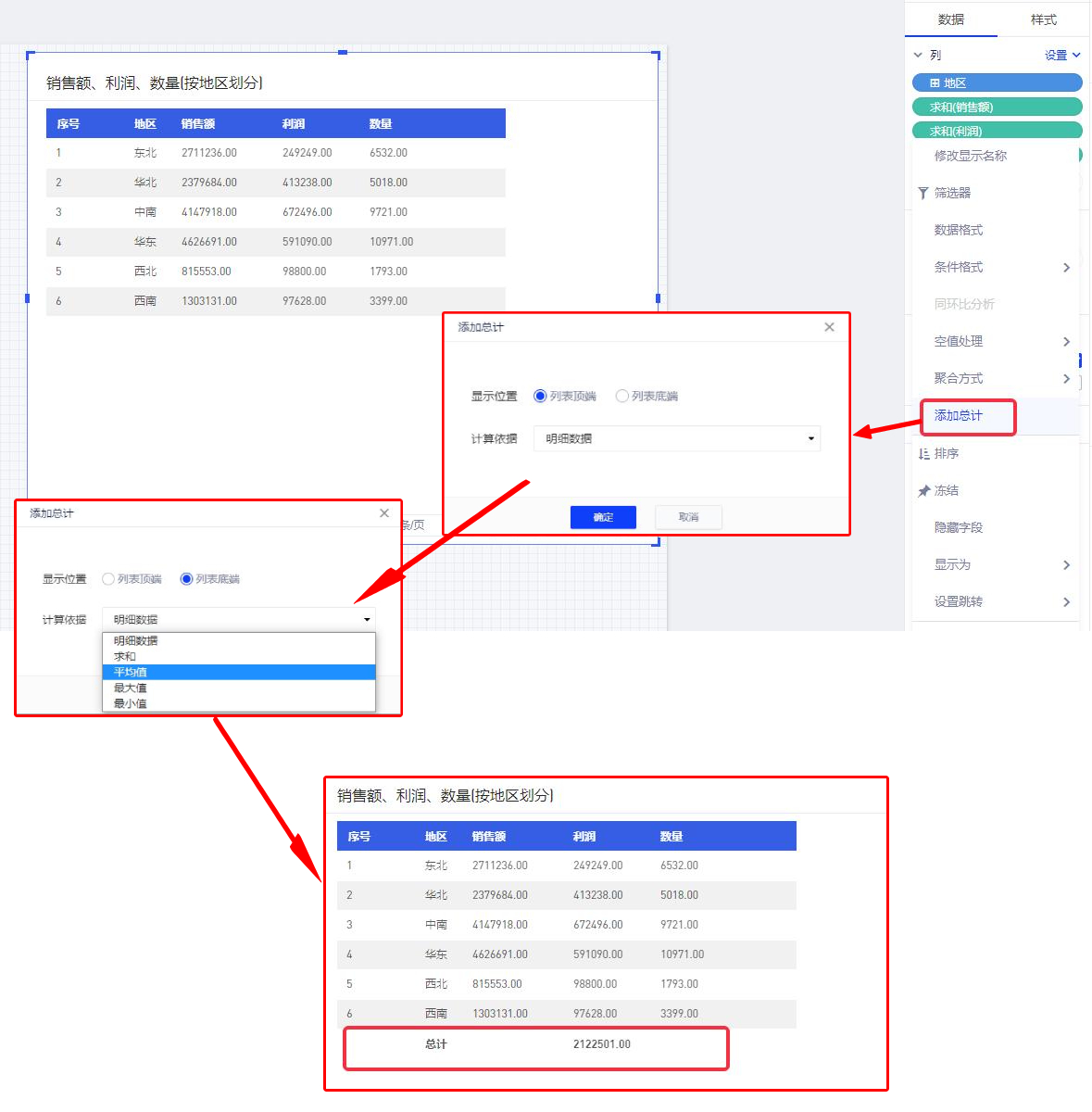 表格支持总计计算,意为可对视图已经聚合的数据进行平均、求和、最大值、最小值等计算。这里以求利润的平均值为例,在字段“利润”上右键呼出菜单,操作示意如下: