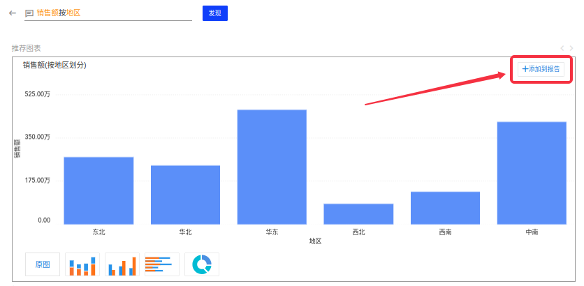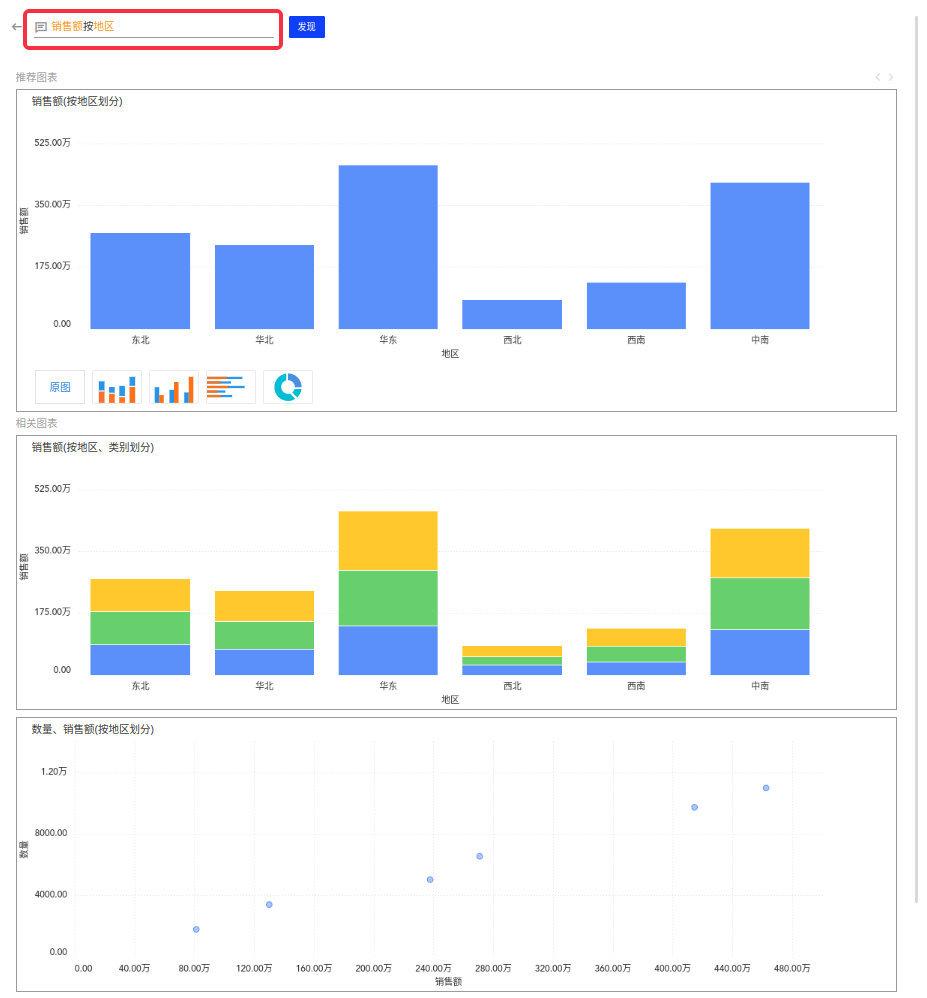 (2)当您输入自然语言提交后,系统会对自然语言进行解析,在该面板的图表展示区自动生成图表。比如输入销售额按地区