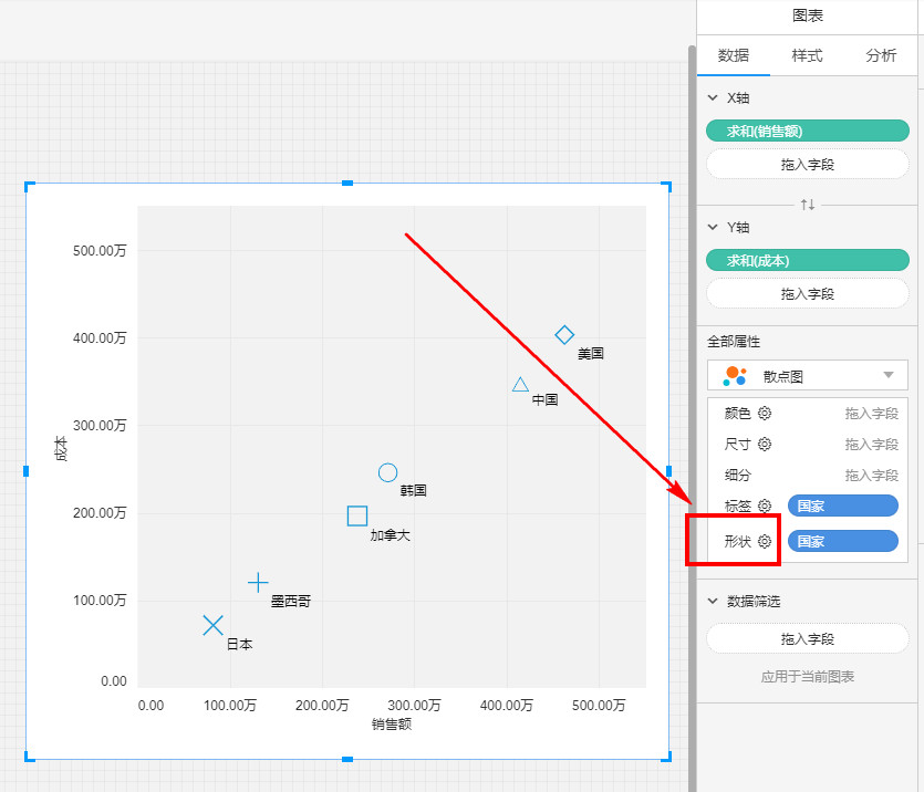 - 属性面板尺寸:每个圆的大小表示了该省份的销售额情况。5. 自定义形状