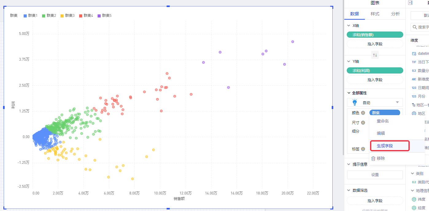 (1)您在图表控件的分析面板勾选聚类分析后,系统将根据kmeans++算法对图表上的数据进行分类,会生成“群集”字段,并放置在“颜色”属性区,用不同颜色来区分不同群集;