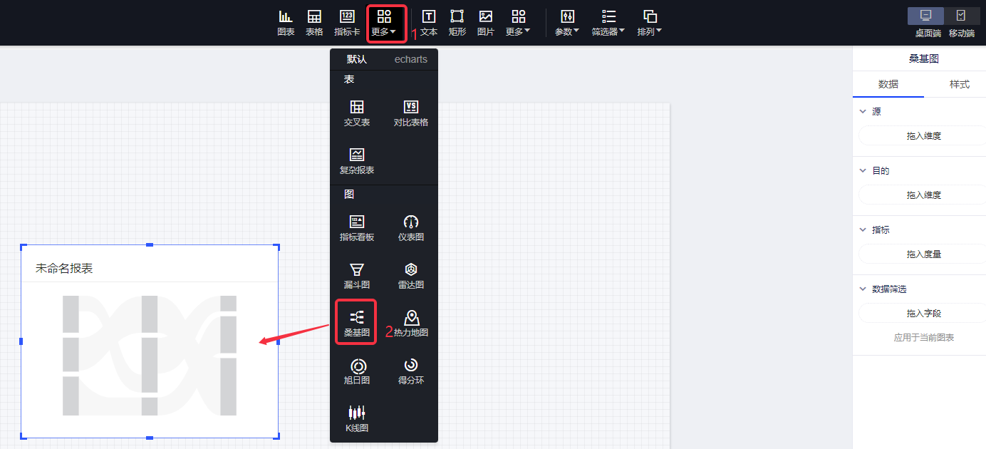 (1)选择“桑基图”控件,在画布上插入一个空白的桑基图;