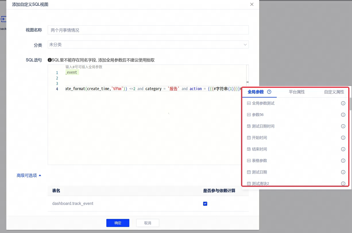 8、【数据准备优化】自定义SQL支持引用系统参数,如用户名、用户属性,实现更敏捷的数据权限管理,输入#号键调用。