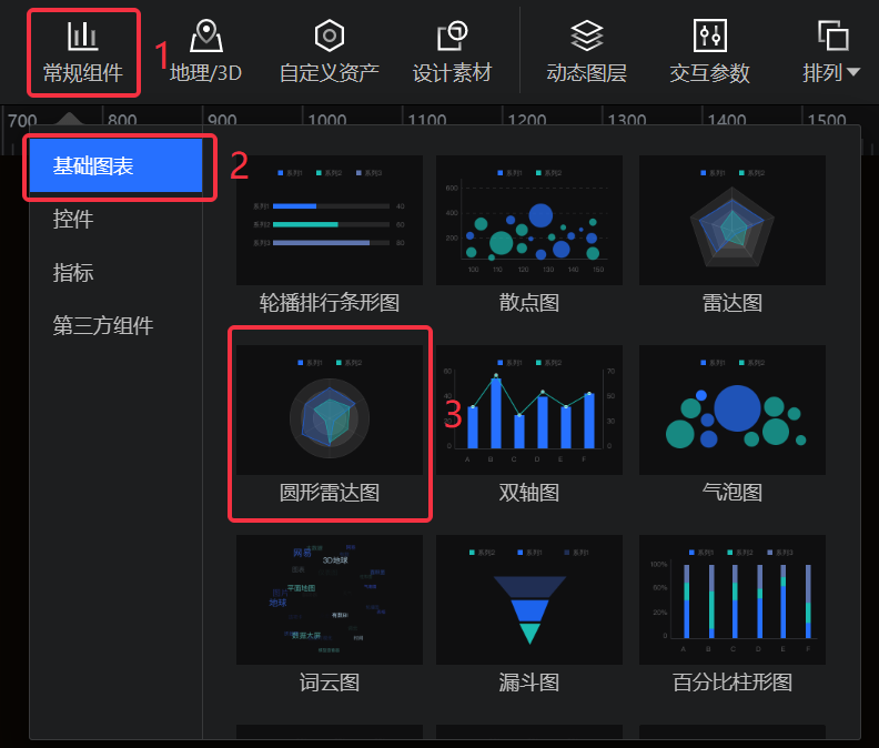 添加3D地图,可以添加标记点、飞线、柱状体子组件