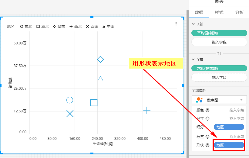 形状只有在绘制散点图时,才会出现。我们可以将“地区”拖入形状,用形状区分不同地区: