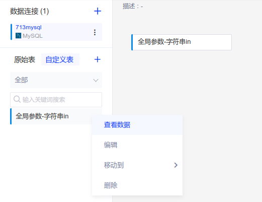 完成自定义SQL视图创建后,新建的表会出现在自定义表tab中,可通过右键唤出菜单执行查看数据、编辑、调整分类和删除操作。