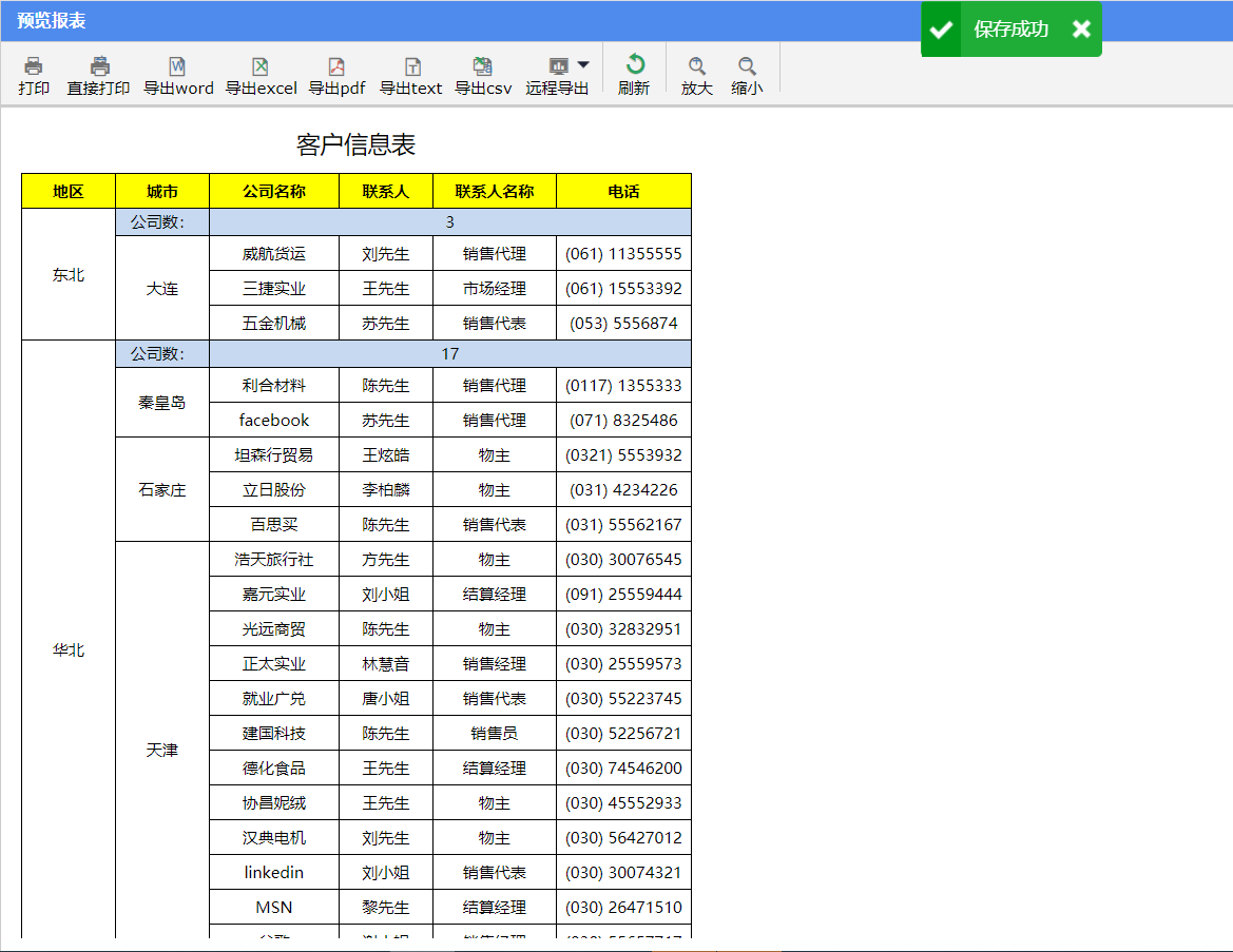 在分组报表中,经常需要对分组数据进行汇总求和、计数等统计运算,例如下图所示的分组报表,汇总统计了每个地区分组下的客户公司数量: